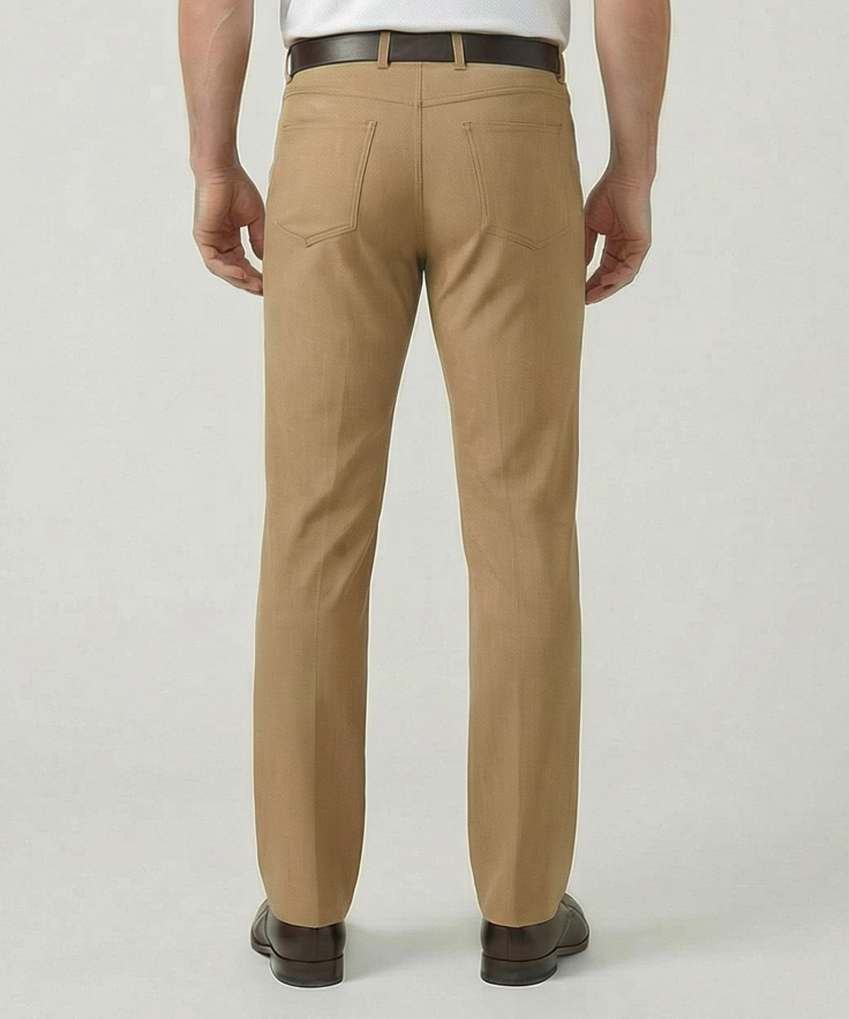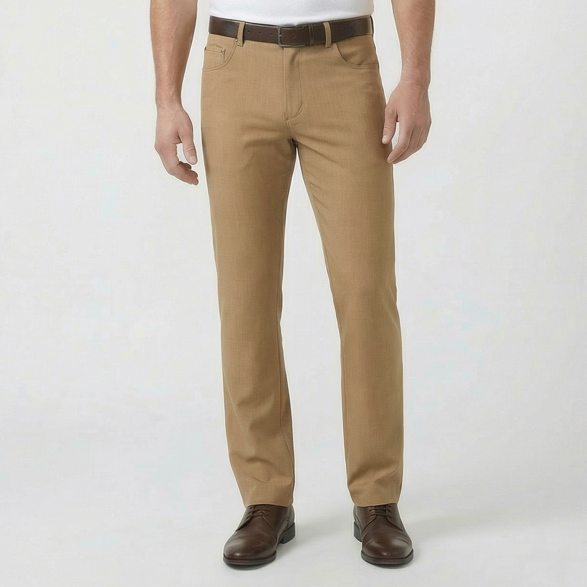 Casual jean styling in a lightweight wool blend fabric gets an added boost from the two-way stretch. Resists wrinkles and maintains its look through a long day on the course or in the office. 53% poly, 43% wool, 4% elastane. Dry clean. 36" unfinished inseam.