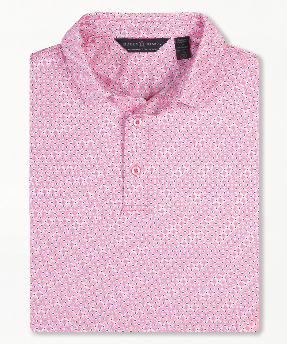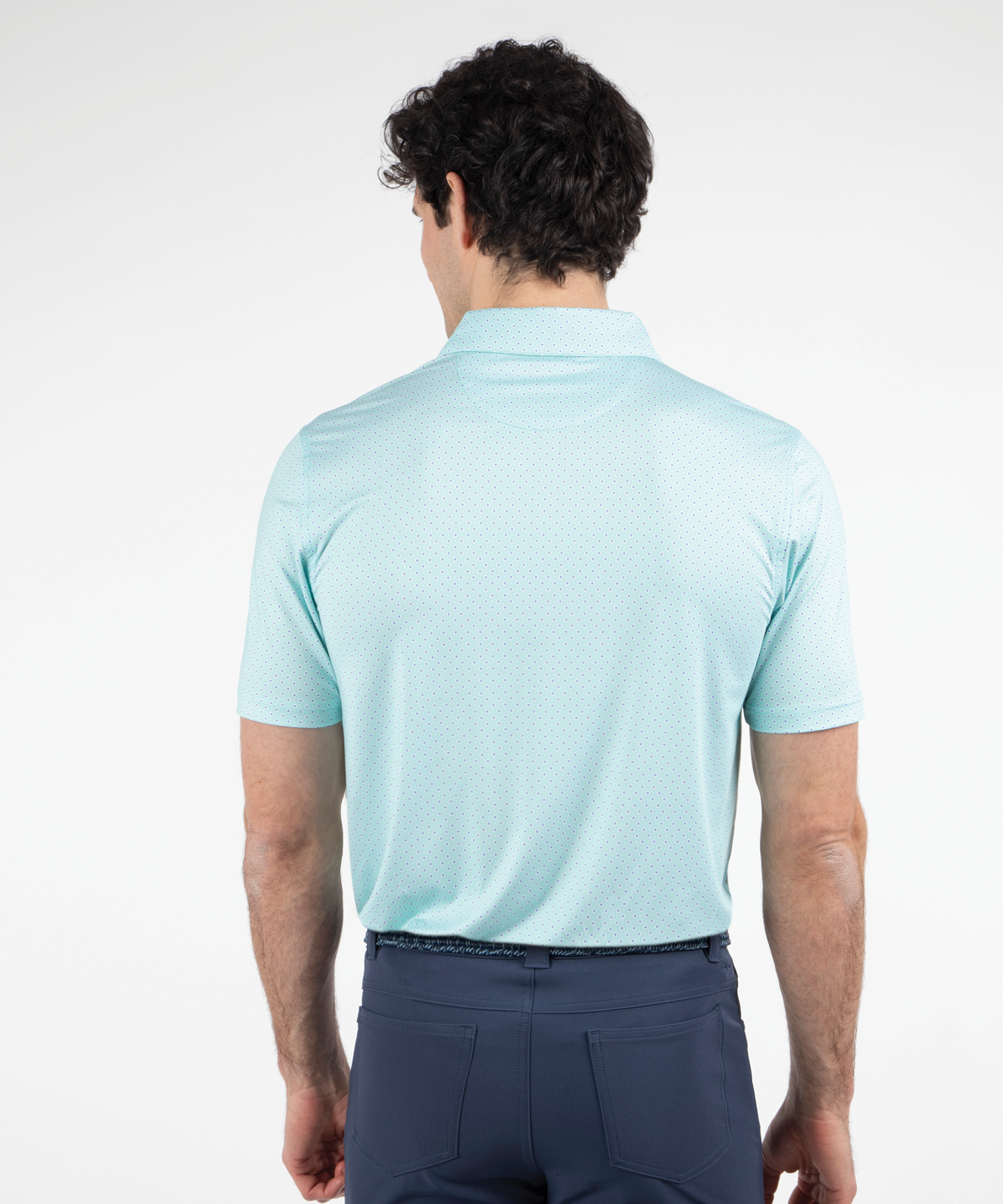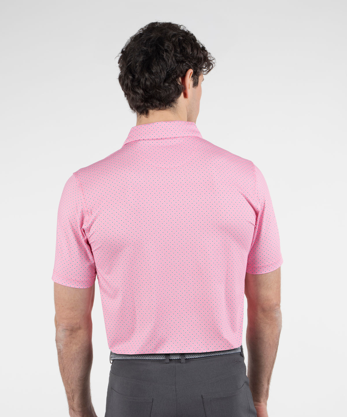 A lightweight performance golf polo featuring a kaleidoscope print and breathable stretch jersey comfort. This moisture-wicking polo delivers odor control and UPF sun protection in a soft performance fabric designed for warm-weather golf and all-day on-course wear.